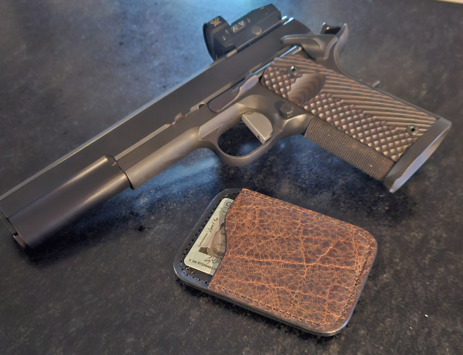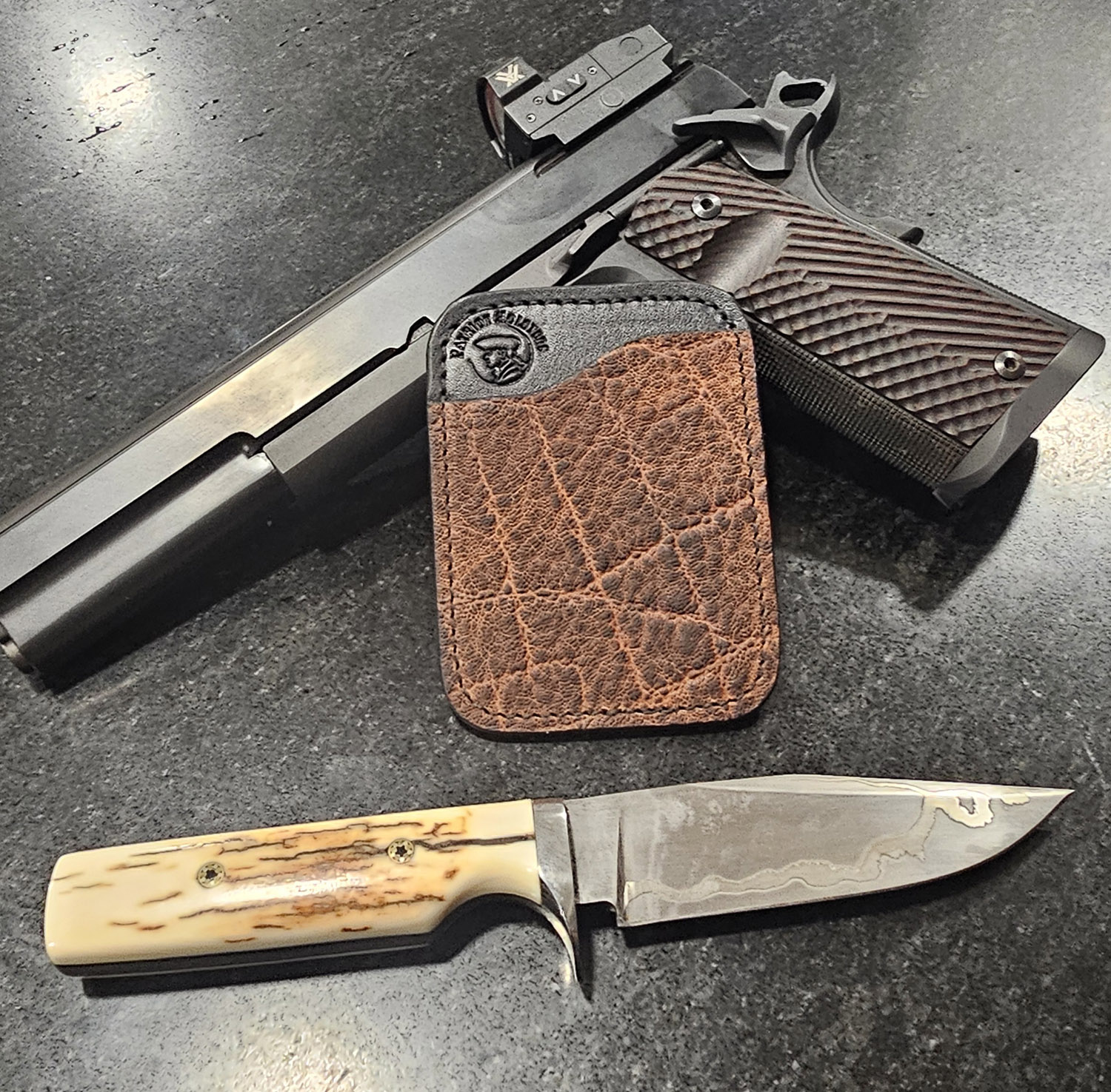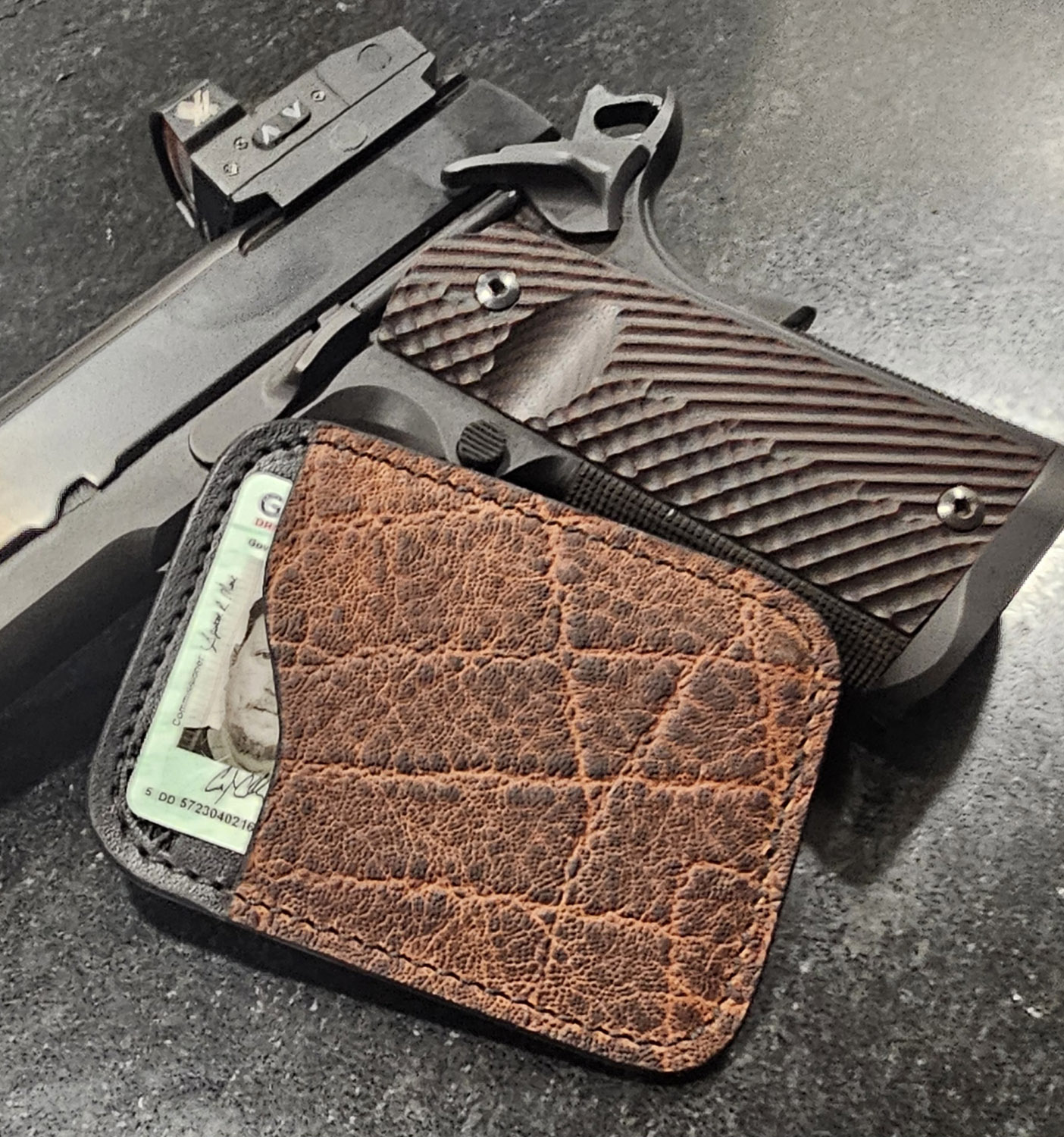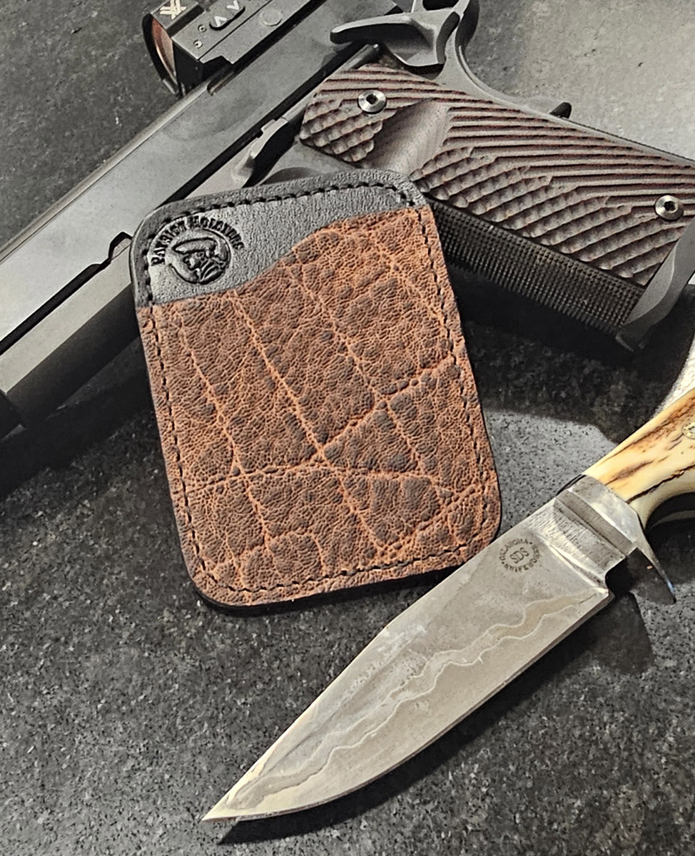 Your Patriot Card Holder can be customized to suit your needs as well as make a statement about who you are. We offer several different leather colors and a variety of hides and skins. You can order your Patriot Card Holder with one, two, three, or four card pockets and can also be made with an opening in the center to hide a bill or two. We also offer an option to add RFID protection. Choose your options and let us hand craft your Patriot Card Holder.