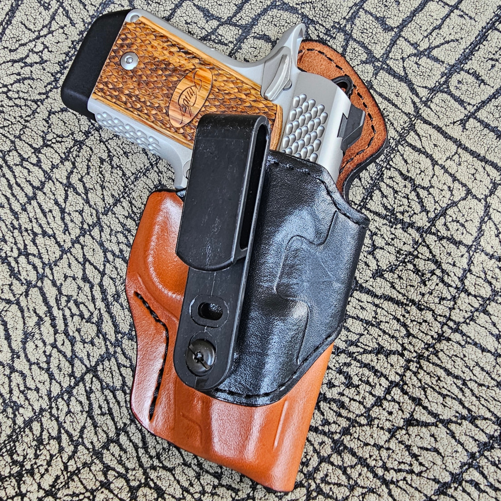 The Parade Rest is a slim, minimalist holster meant to be worn near the small of the back. The draw from this holster is with your palm facing outward. The Parade Rest is generally worn with a negative cant (draw angle). This holster is worn Inside the Waistband (IWB) and attaches to the belt with a single narrow, tuckable clip that can be adjusted so our Patriots can fine tune their draw angle.